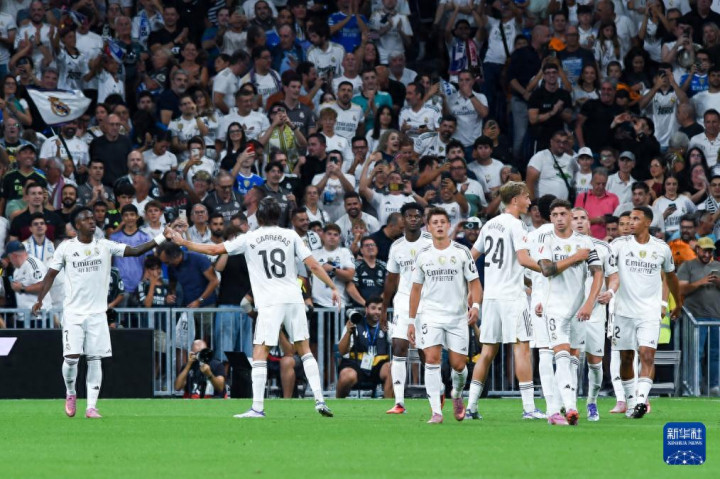 8月30日,皇家马德里队球员庆祝进球。新华社发(古斯塔沃·巴连特摄)