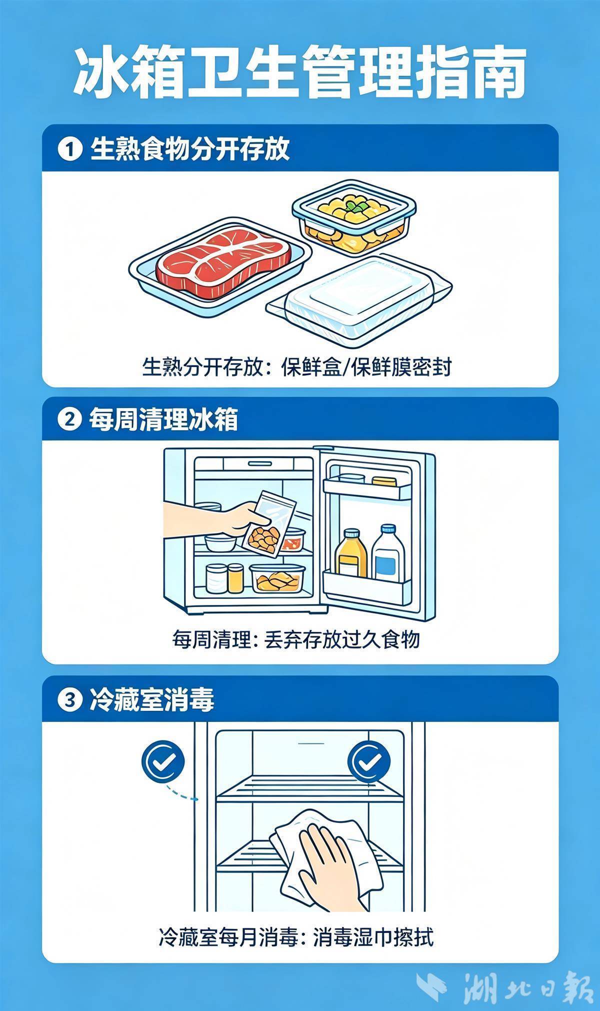 生熟分开存放,用保鲜盒或保鲜膜密封;每周清理一次冰箱,扔掉存放过久的食物;冷藏室建议每月用消毒湿巾擦拭一次。