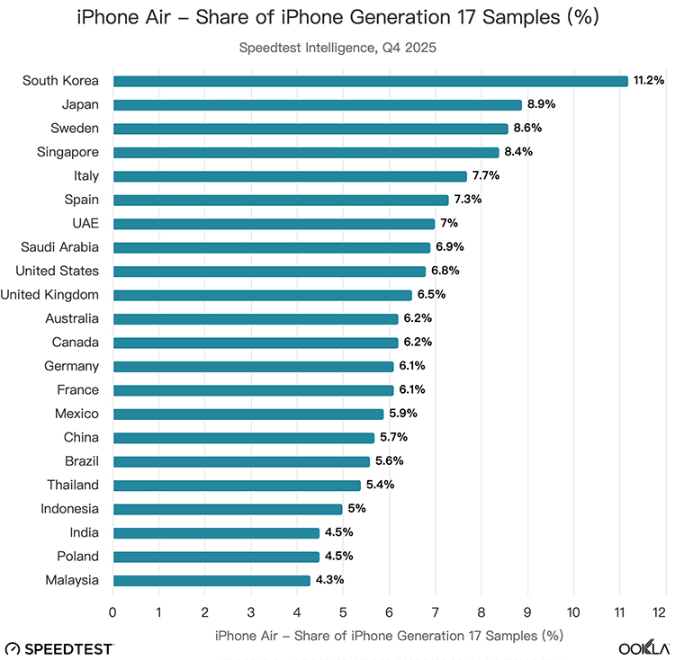 根据Speedtest的数据,iPhone Air普及率最高的前3个国家是韩国(11.2%)、日本(8.9%)和瑞典(8.6%),在美国的普及率仅有6.8%,表现甚至不如意大利(7.7%)、西班牙(7.3%)等欧洲国家。而在中国,普及率只有5.7%,已经属于后排了。
